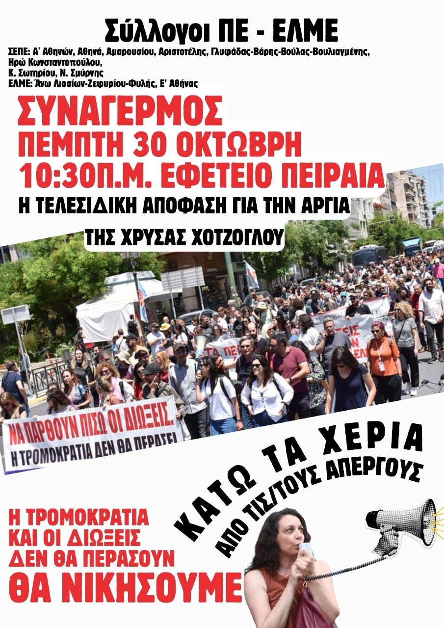 Κοινή αφίσα Συλλόγων ΠΕ - ΕΛΜΕ κάλεσμα στις 30/10, στις 10:30 πμ, στο εφετείο Πειραιά για την ακύρωση της δυνητικής αργίας της Χρύσας Χοτζόγλου (οριστική απόφαση)/Να είμαστε όλες και όλοι εκεί!