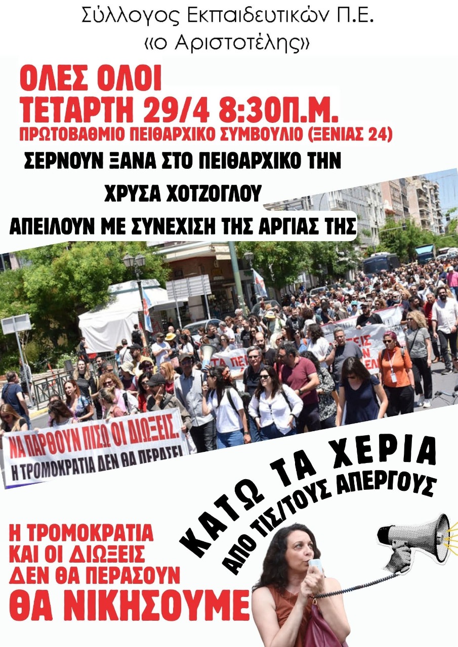 Αριστοτέλης: Τετάρτη 29 Απρίλη απεργιακή συγκέντρωση στο Πρωτοβάθμιο Πειθαρχικό Συμβούλιο Αττικής (Ξενίας 24, Αθήνα), στις 8:30πμ, με 1-4 ώρες στάση εργασίας γιατί σέρνουν ξανά τη Χρ. Χοτζόγλου για τη συνέχιση της δυνητικής της αργίας για έναν ακόμα χρόνο