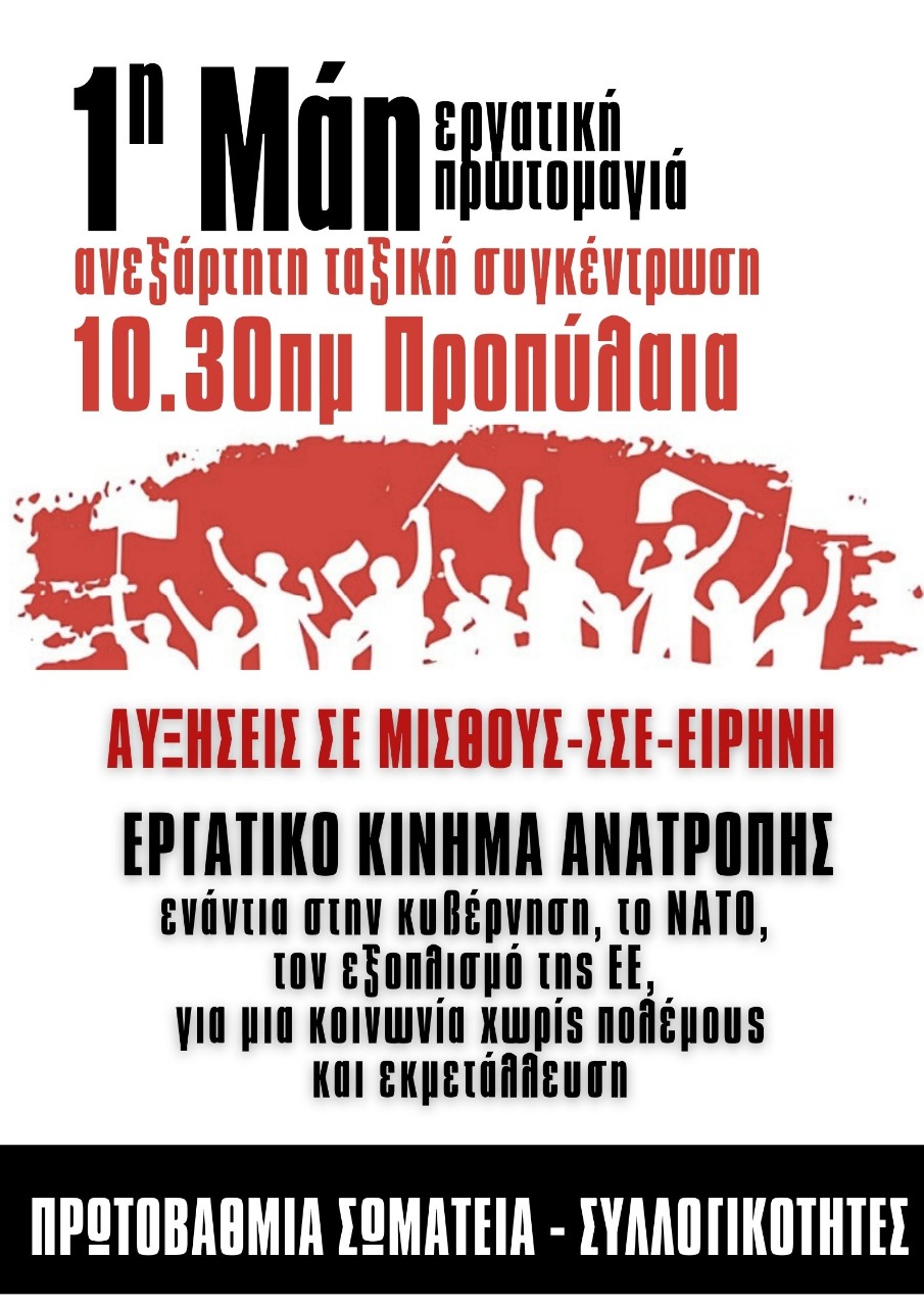 Δελτίο τύπου με κοινό κάλεσμα πρωτοβάθμιων σωματείων και συλλόγων εργαζομένων, για Ανεξάρτητη Ταξική Συγκέντρωση 1η Μάη Προπύλαια, 10:30πμ