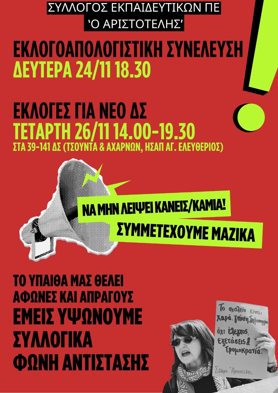 Αριστοτέλης: Τακτική Γενική Συνέλευση Δευτέρα 24/11 στις 6:30μμ και εκλογές για νέο ΔΣ Τετάρτη 26/11 από 2:00-7:30μμ, χωρίς άδεια στα 39ο- 141ο ΔΣ (Τσούντα κι Αχαρνών, ΗΣΑΠ Αγ. Ελευθερίου)