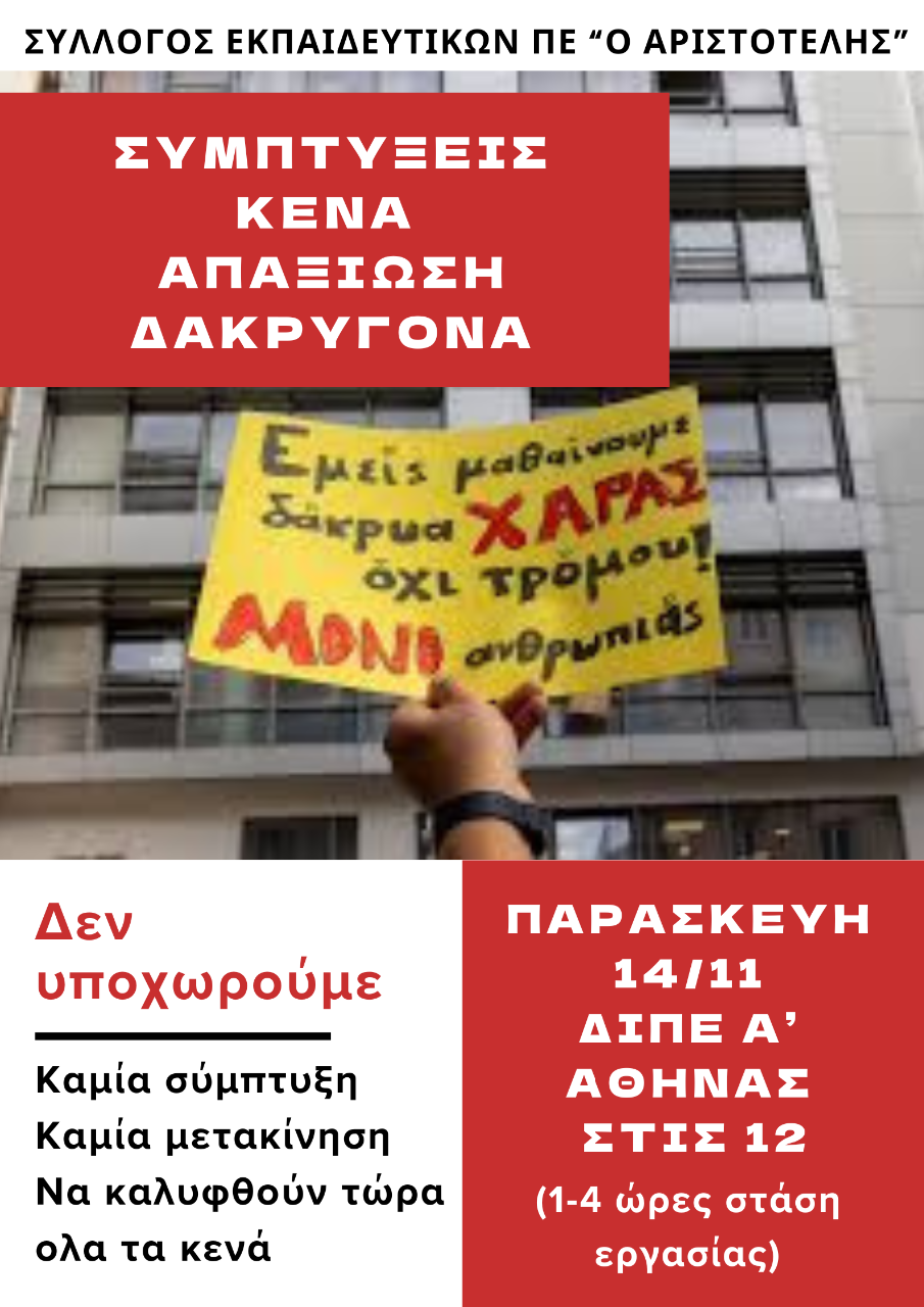 Αριστοτέλης: Πέμπτη 6 Νοέμβρη όλες και όλοι στο πανεκπαιδευτικό συλλαλητήριο εκπαιδευτικών, μαθητ(ρι)ών, φοιτητ(ρι)ών στα Προπύλαια στις 12.00 με πορεία στη Βουλή- Κήρυξη διευκολυντικής στάσης εργασίας (1-4 ώρες) στο πρωινό και απογευματινό πρόγραμμα