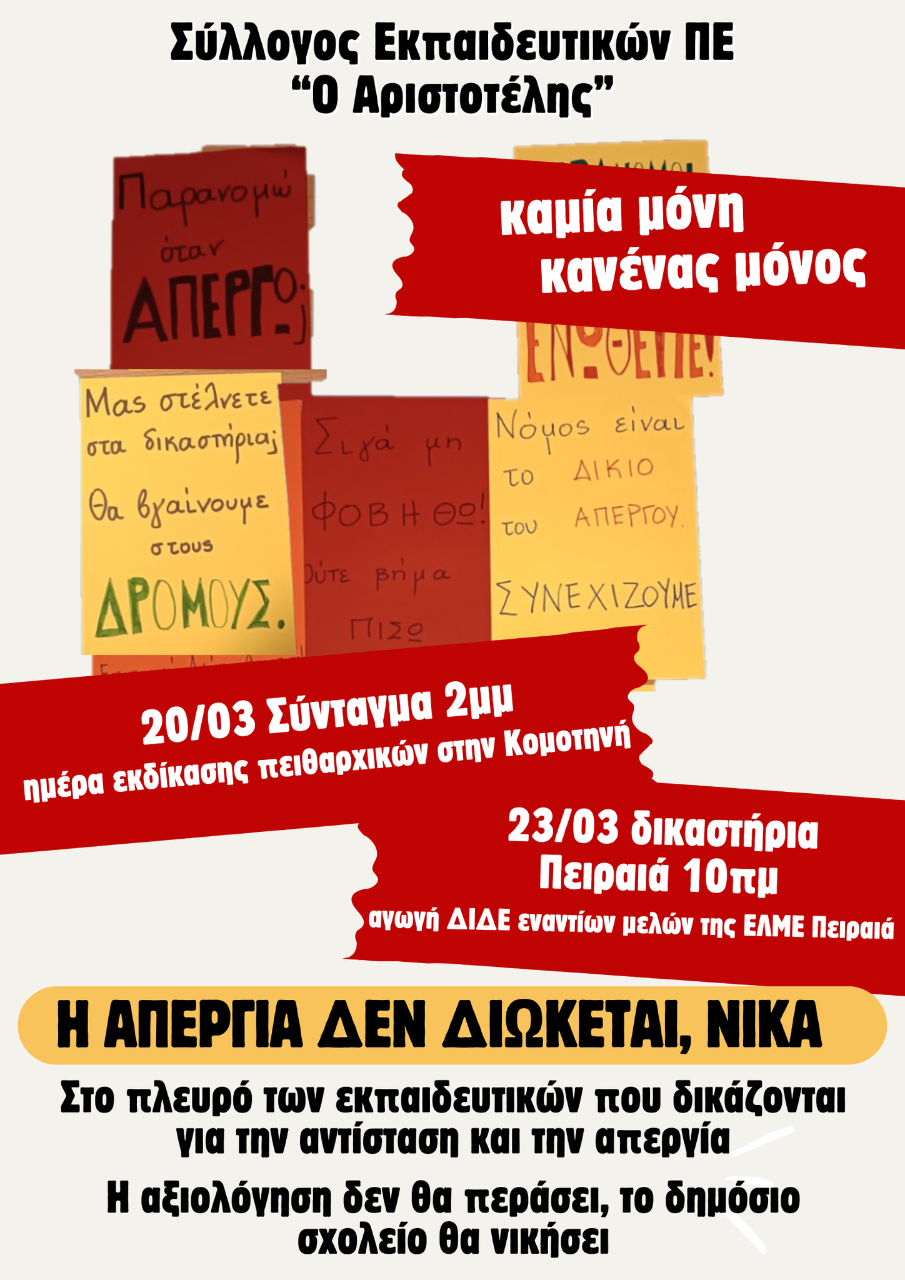 Δευτέρα 23.03, 10:00πμ, δικαστήρια Πειραιά, στήριξη στους διωκόμενους από ΕΛΜΕ Πειραιά και ΕΚΠ από τον ΔΙΔΕ Πειραιά που κατέθεσε αγωγή εναντίων τους εδώ
