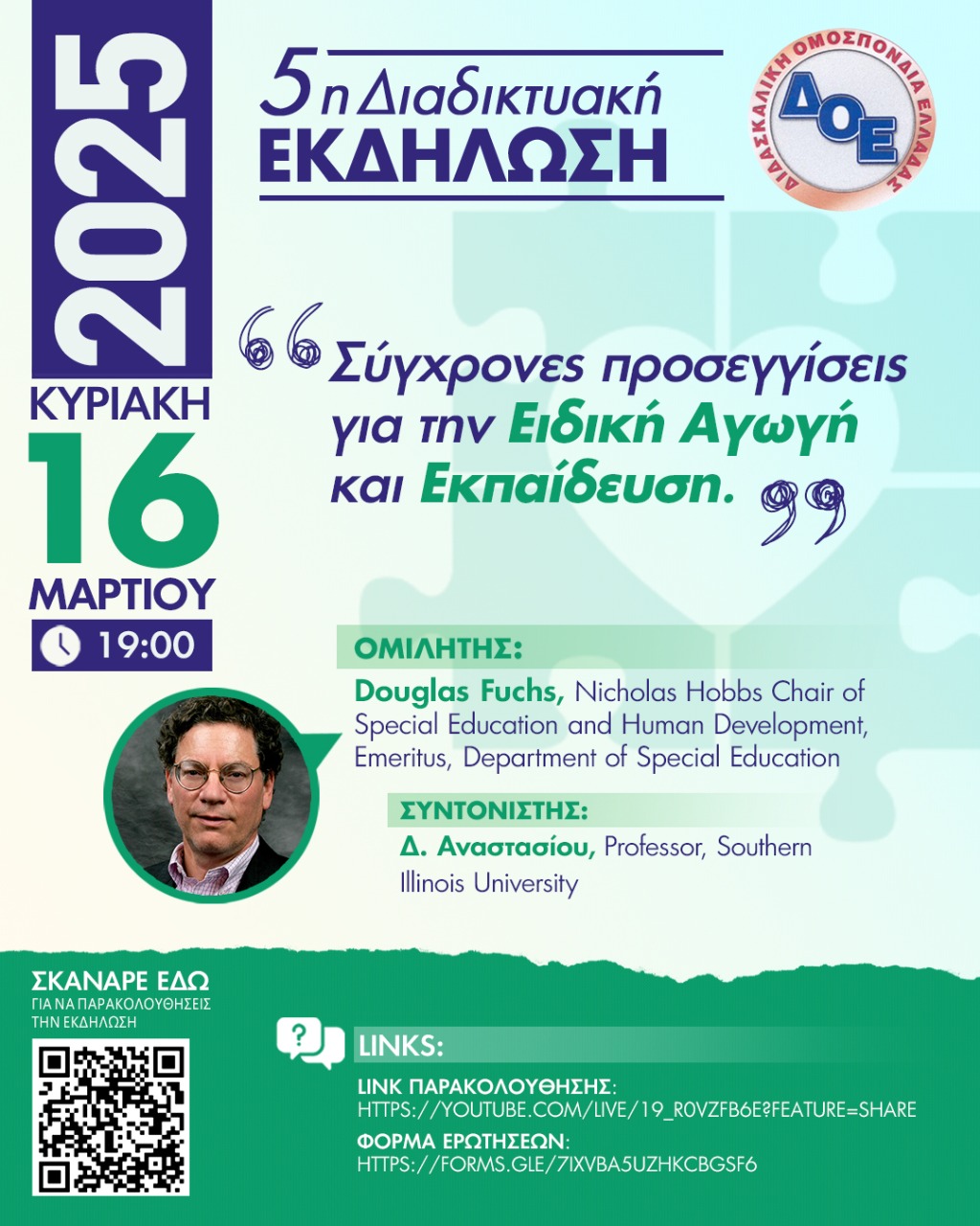 Σε αυτό το πλαίσιο πραγματοποιείται η πέμπτη διαδικτυακή εκδήλωση την Κυριακή 16 Μαρτίου 2025, με τίτλο: «Σύγχρονες προσεγγίσεις για την Ειδική Αγωγή και Εκπαίδευση»