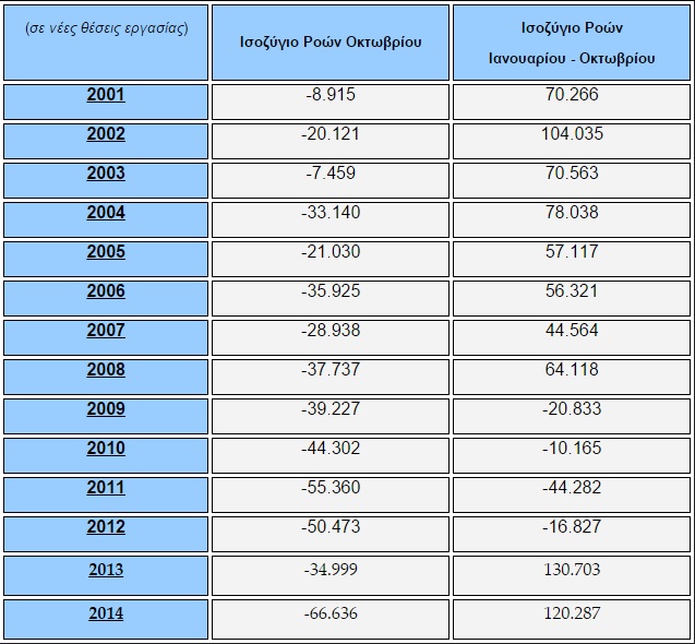 Συγκεκριμένα, για πρώτη φορά από το 2001, το μήνα Οκτώβριο του 2014 οι αποχωρήσεις (σ.σ. αναγγελίες οικειοθελούς αποχώρησης, καταγγελίες συμβάσεων ορισμένου χρόνου, λήξεις συμβάσεων) ήταν κατά 66.636 περισσότερες από τις προσλήψεις. Έτσι διαμορφώθηκε ένα αντίστοιχο πρωτοφανές για τα τελευταία δεκαπέντε χρόνια έλλειμμα στο ισοζύγιο της απασχόλησης. Ενδεικτικά αναφέρεται πως το 2013, το έλλειμμα αυτό ανήλθε μόλις στις 39.227 αποχωρήσεις, το 2012 στις 44.302, το 2011 στις 55.360, το 2010 στις 50.473 και το 2009 στις 34.999 αποχωρήσεις.