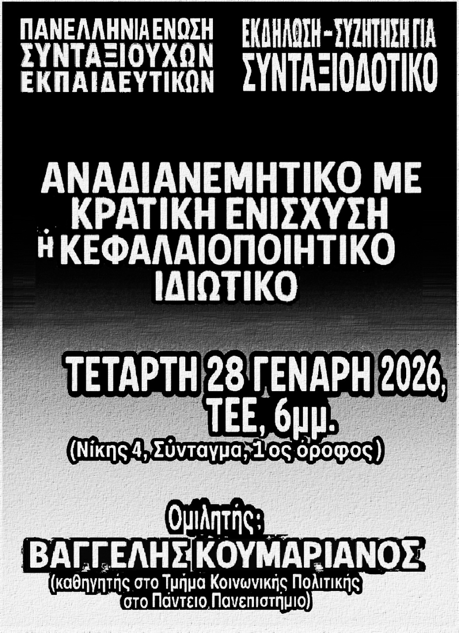 Η Πανελλήνια Ένωση Συνταξιούχων Εκπαιδευτικών (ΠΕΣΕΚ) καλεί τα μέλη της και κάθε συνάδελφο συνταξιούχο, εκπαιδευτικούς, εργαζόμενους, τους νέους και κάθε άνθρωπο που αγωνιά για το μέλλον της κοινωνικής ασφάλισης σε μια ανοιχτή εκδήλωση – συζήτηση για το ασφαλιστικό και συνταξιοδοτικό σύστημα της χώρας, το παρόν και το μέλλον του. Η εκδήλωση θα πραγματοποιηθεί την Τετάρτη 28 Γενάρη 2026, στις 6μμ, στην αίθουσα του 1ου ορόφου του ΤΕΕ (Νίκης 4, Σύνταγμα), με ομιλητή το Βαγγέλη Κουμαριανό, καθηγητή στο Τμήμα Κοινωνικής Πολιτικής του Παντείου Πανεπιστημίου.