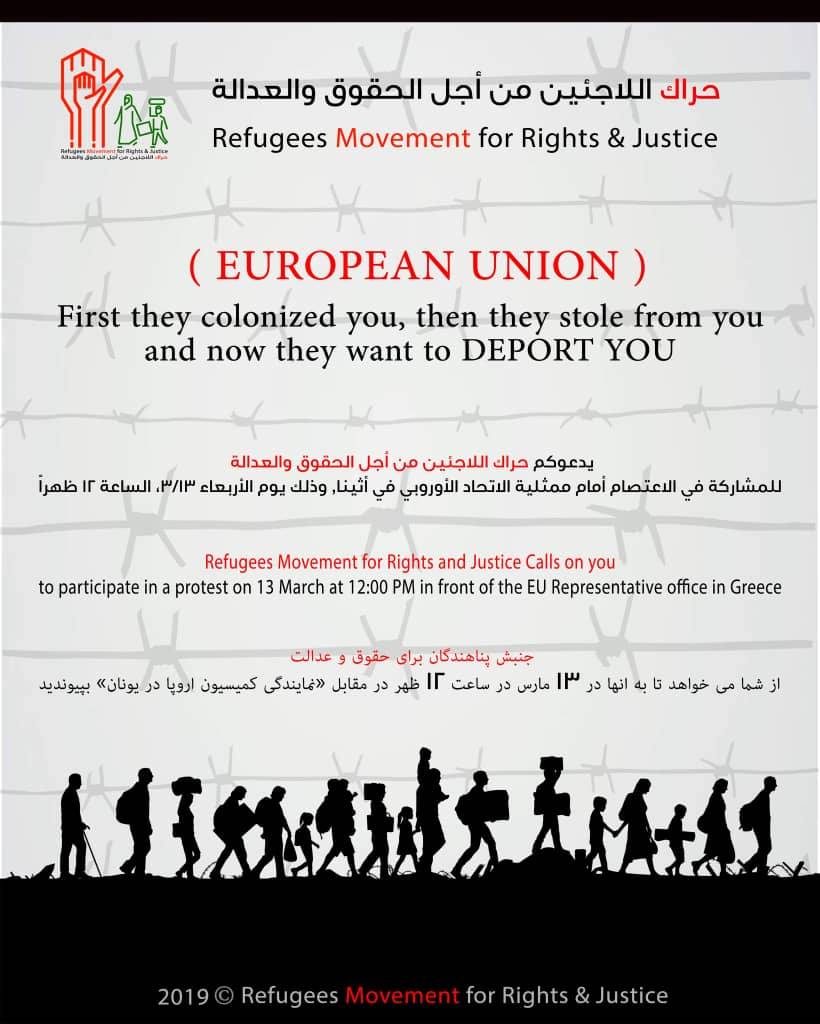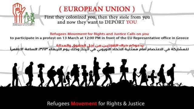 Συντονισμός για το Προσφυγικο/Μεταναστευτικό, Εργατικών Σωματείων, Φοιτητικών Συλλόγων και Συλλογικοτήτων: Κάλεσμα σε συγκέντρωση διαμαρτυρίας και πορεία την Τετάρτη 13 Μάρτη στις 12 το μεσημέρι στο Σύνταγμα μαζί με τους πρόσφυγες και μετανάστες