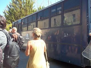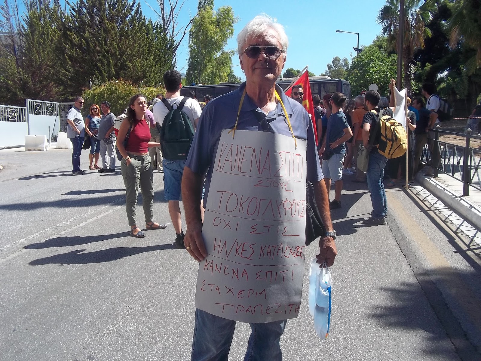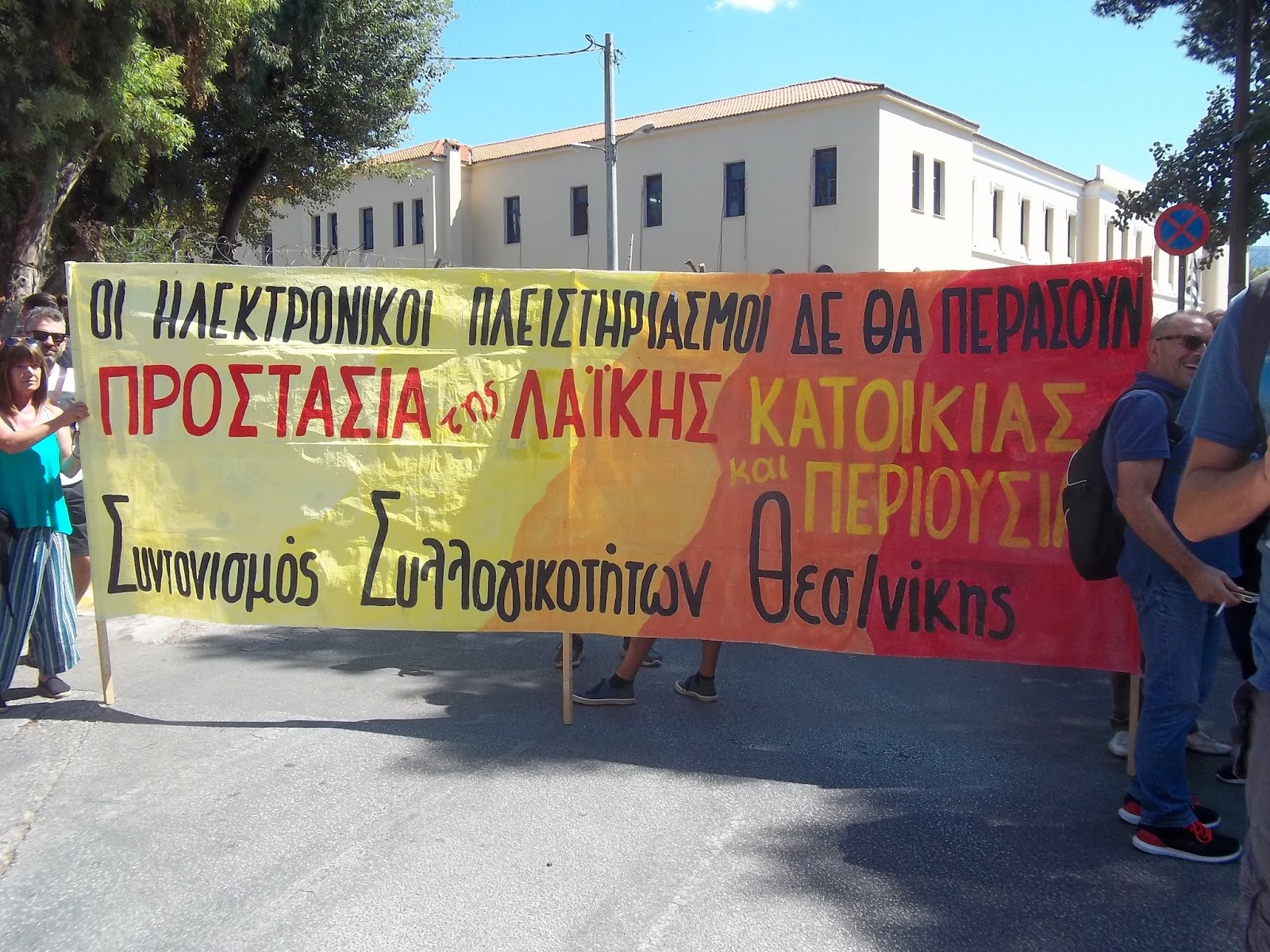 Ο υπουργός Δικαιοσύνης που δυο μέρες πριν “έσταζε μέλι” για τους μεγαλοσυμβολαιογράφους της Συντονιστικής Επιτροπής των Συμβολαιογραφικών Συλλόγων/εκπροσώπους των τραπεζών και συνένοχους στην προσπάθεια εφαρμογής των ηλεκτρονικών πλειστηριασμών για την αρπαγή της λαϊκής κατοικίας και περιουσίας– την ημέρα της συγκέντρωσης (και παρά το από μέρες πριν σταλμένο αίτημα συνάντησής του μαζί μας), απλά απουσίαζε. Στη θέση του άφησε πλήθος αστυνομικών δυνάμεων που έστησαν φραγμό απέναντι στους διαδηλωτές (και αφού πιο πριν περιπολικό της αστυνομίας παρακολουθούσε το λεωφορείο των διαδηλωτών από τη Θεσσαλονίκη) καθώς και το γεν. γραμματέα του υπουργείου κ. Σάρλη, ο οποίος όμως από την πρώτη στιγμή δήλωσε αναρμόδιος για το θέμα των πλειστηριασμών…
