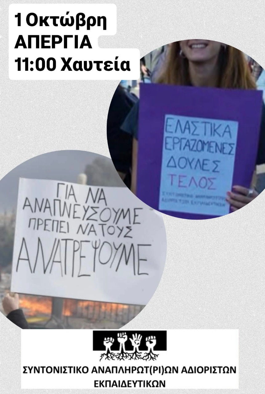 Συντονιστικό Αναπληρωτών Αδιόριστων Εκπαιδευτικών - ΑΝΑΚΟΙΝΩΣΗ – ΚΑΛΕΣΜΑ ΣΤΗΝ ΑΠΕΡΓΙΑ ΤΗΣ 1ΗΣ ΟΚΤΩΒΡΗ -11πμ Χαυτεία