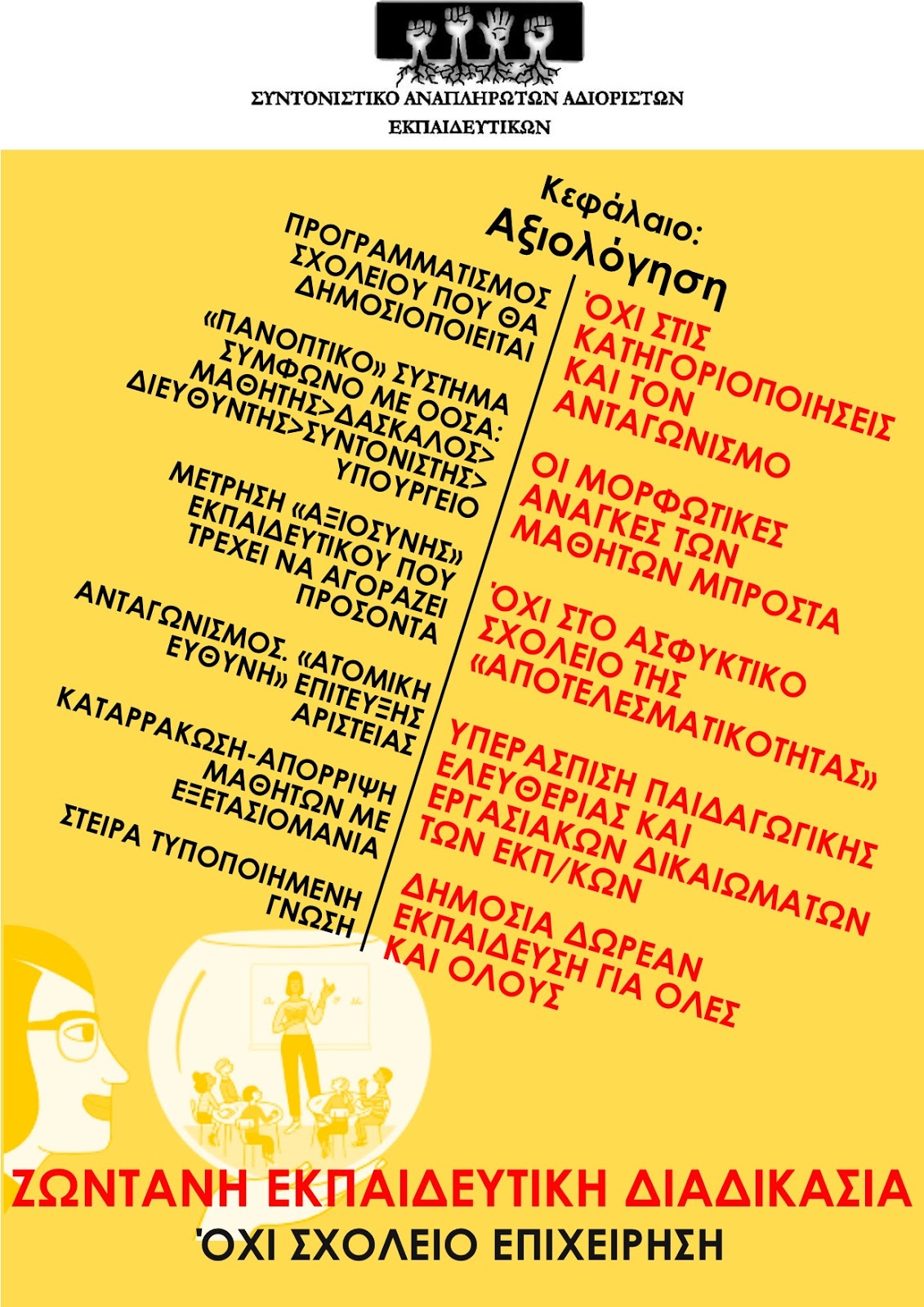 Με αποφάσεις για Απεργία-Αποχή από κάθε διαδικασία αξιολόγησης το εκπαιδευτικό κίνημα θα απαντήσει, με πρώτο σταθμό αυτόν ενάντια στην αυτοαξιολόγηση σχολικής μονάδας, μέσα στους συλλόγους διδασκόντων και στις Γενικές συνελεύσεις συλλόγων.