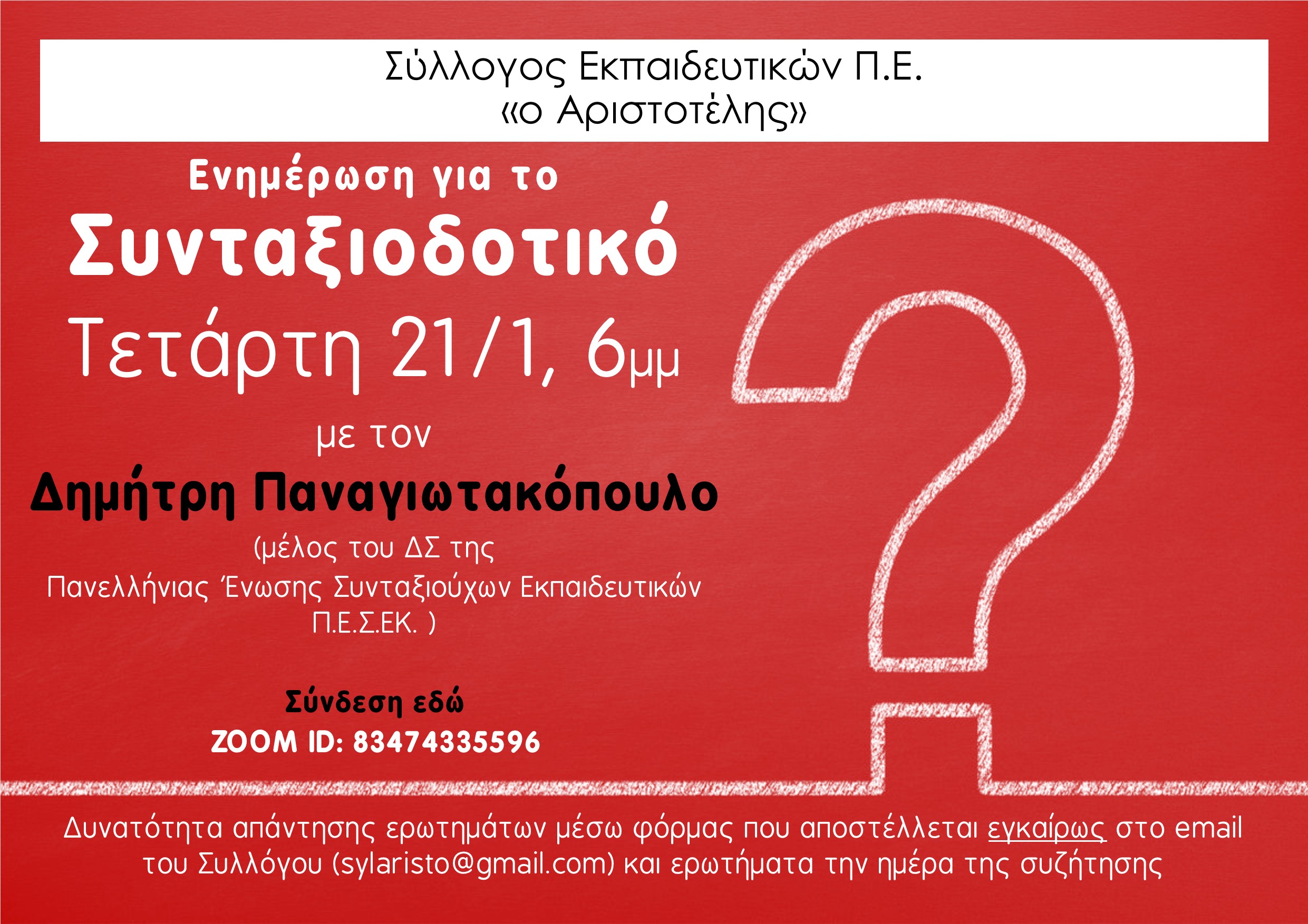 Τετάρτη 21 Ιανουαρίου 2026, 18.00, διαδικτυακή ενημερωτική για το συνταξιοδοτικό-ασφαλιστικό πλαίσιο και οι προϋποθέσεις για τη συνταξιοδότηση των εκπαιδευτικών το 2026. Συντάξιμες αποδοχές όλων όσοι σκέφτονται να αποχωρήσουν από την υπηρεσία τη φετινή χρονιά.