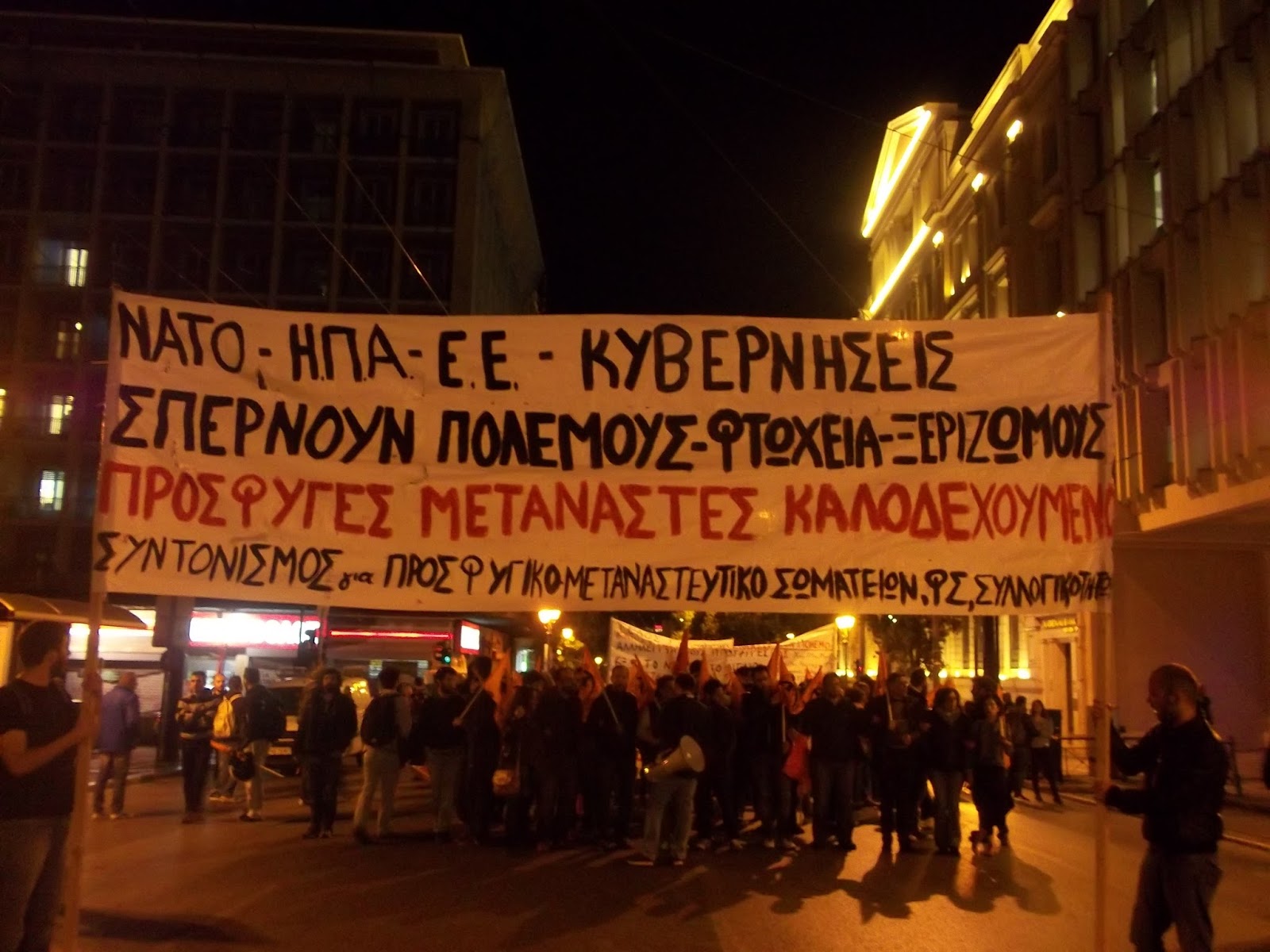 Πάνω από τρεις χιλιάδες διαδηλωτές συμμετείχαν στην συγκέντρωση στα Προπύλαια και στην πορεία που διοργάνωσε το απόγευμα της Τετάρτης προς το Σύνταγμα, τα γραφεία της ΕΕ και την αμερικανική πρεσβεία ο Συντονισμός για το Προσφυγικο-Μεταναστευτικό σωματείων, φοιτητικών συλλόγων και συλλογικοτήτων καθώς και πλήθος πολιτικών οργανώσεων.