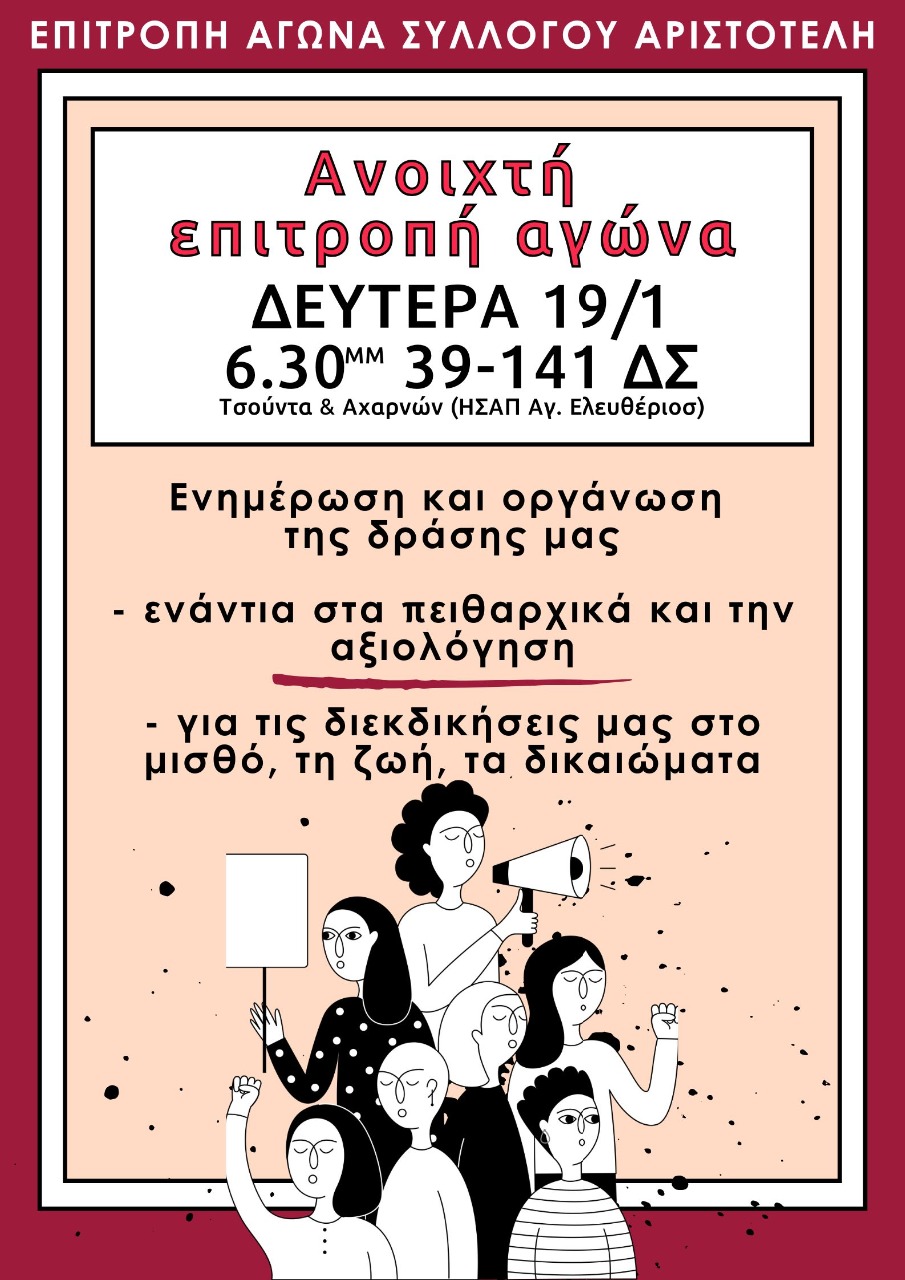 Αρχική Σελίδα > Επιτροπή Αγώνα: Δευτέρα 19.01, ενημέρωση και οργάνωση της δράσης μας ενάντια στα πειθαρχικά και την αξιολόγηση, για τις διεκδικήσεις μας στον μισθό, τη ζωή, τα δικαιώματα